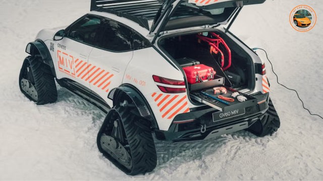 The GV60 MIV is far more than just an aesthetically striking prototype; it is a purpose-built rescue vehicle designed for all-terrain emergency missions. One of the most crucial elements of any rescue vehicle is its visibility. The GV60 MIV sports a hi-vis orange-striped livery, ensuring that it stands out even in heavy snowfall or foggy conditions. Emergency responders working in blizzards or dense forests require a vehicle that remains easily identifiable, and this bright color scheme achieves just that. The most noticeable modification is the replacement of standard wheels with tank-style snowmobile tracks. These tracks drastically improve traction and enhance ground clearance, enabling the GV60 MIV to glide over deep snow without sinking. Unlike conventional tires, which can struggle in icy or powdery conditions, these tracks distribute weight evenly and allow the vehicle to maintain stability even in treacherous terrains. To accommodate the increased width of the tracks, Genesis has also installed carbon-fiber fender flares, which extend the vehicle’s stance, improving its off-road capabilities and balance. The combination of these enhancements ensures that the GV60 MIV can handle unpredictable and extreme conditions with ease.